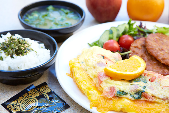 ご滞在中毎日お楽しみいただけるようにさまざまなメニューを揃えてお待ちしております。お味噌汁、納豆、漬物、サラダもご用意しています。