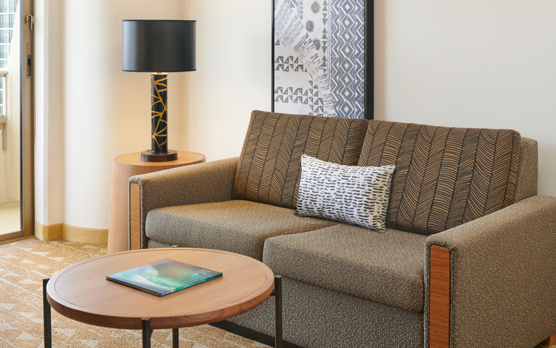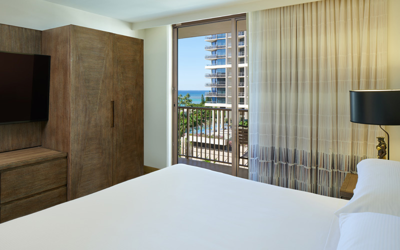リビングルームと寝室が独立しているお部屋です。ワイキキの街並みと海の一部を望みます。 1ベッドルームのお部屋: キングベッド1台またはクイーンベッド2台 リビングルームにはソファベッド、テーブルと椅子、ウェットバー、ミニ冷蔵庫、電子レンジがあります。 ご宿泊のすべてのお客様はご予約の宿泊プランにかかわらず、毎日の朝食、プールサイドでドリンクを楽しめるプールサイド・レセプションをご利用いただけます。