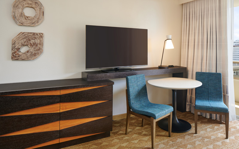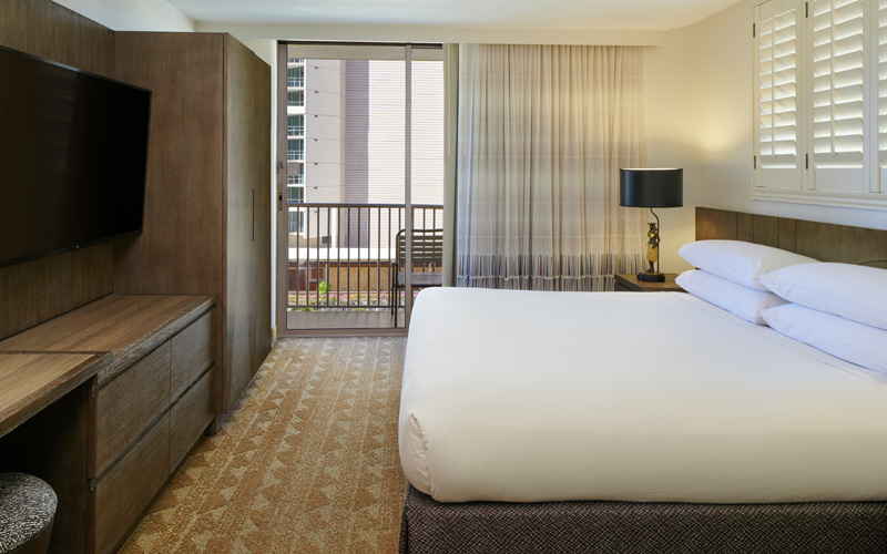 リビングルームと寝室が独立している低層階のお部屋です。ワイキキの街並みを望みます。 1ベッドルームのお部屋: キングベッド1台、またはクイーンベッド2台 リビングルームにはソファベッド、テーブルと椅子、ウェットバー、ミニ冷蔵庫、電子レンジがあります。 ご宿泊のすべてのお客様はご予約の宿泊プランにかかわらず、毎日の朝食、プールサイドでドリンクを楽しめるプールサイド・レセプションをご利用いただけます。